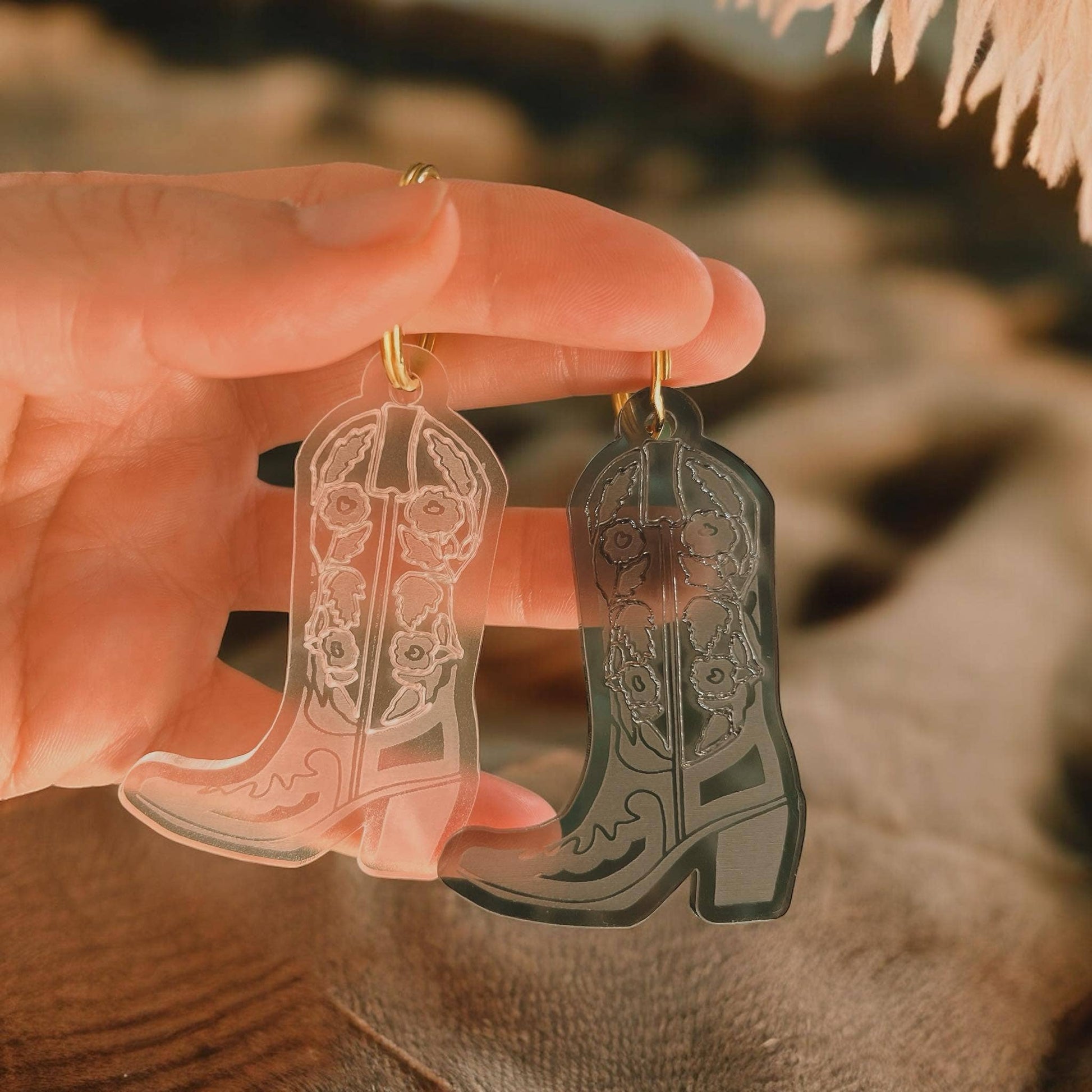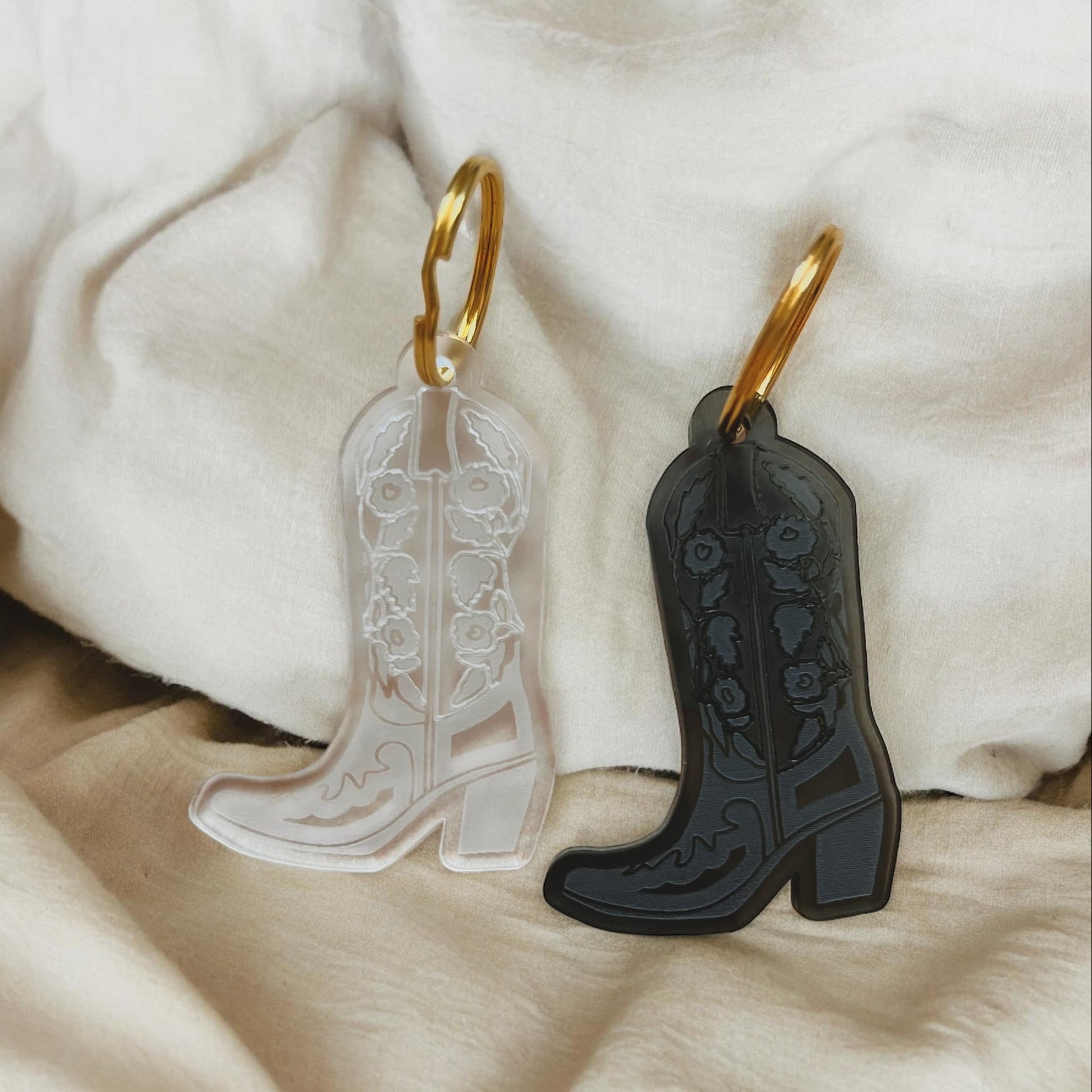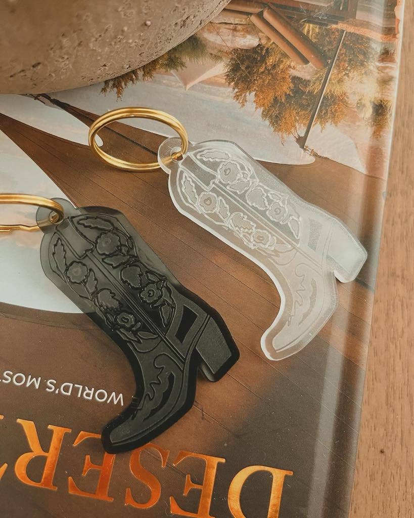 Floral Rose Cowboy Boot Western Style Keychain in your choice of midnight black or Frosty White. Comes with a gold or silver keyring. Made out of durable acrylic.